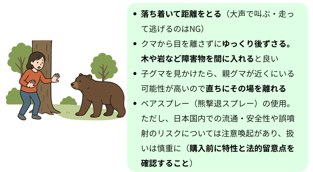 ツキノワグマは通常人を避けますが、餌を求めて人里に出ることがあります。以下を情報から、事前対策と遭遇時の行動の参考にしてください。