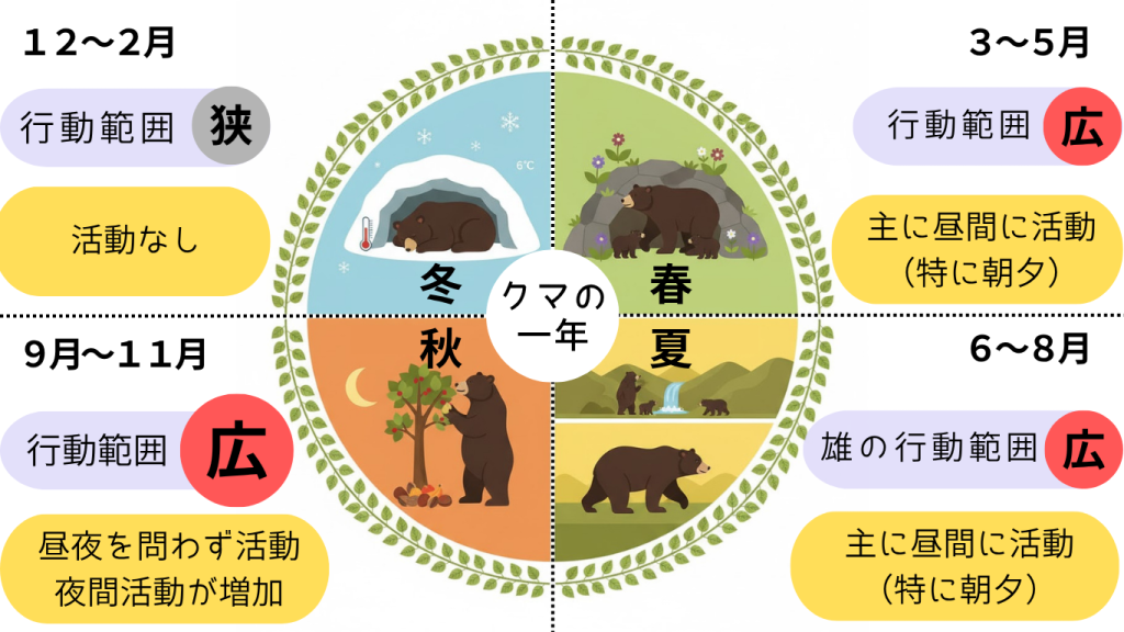 ※6℃前後で冬眠するため、暖冬の年は早く冬眠が明ける場合も。 - 活動時間帯:クマは基本的に昼行性だが、特に朝夕(薄明薄暮時)に活発に活動。人里に近い場所では、人との接触を避けるために夜間に活動する傾向が強くなる。