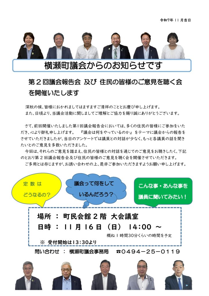 第2回議会報告会 及び 住民の皆様のご意見を聴く会を開催いたしますので、皆様お誘い合わせの上、是非ご参加いただきますようお願いいたします。